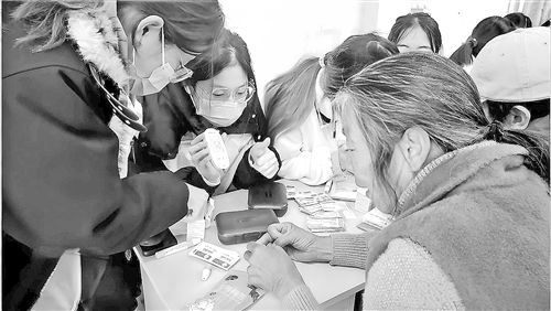志愿者正在为老人测量血糖。(华宣)