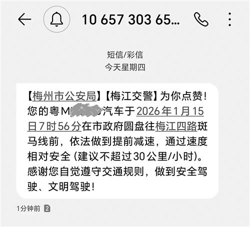 据了解,“夸夸短信”是梅江公安交管大队积极探索人性化执法模式的创新举措,通过对重点路段、路口斑马线前提前减速礼让行人的车辆进行精准定位,由系统不定期向车辆驾驶人推送“夸夸短信”。短信内容既详细标注了文明驾驶的时间、地点,明确告知了驾驶车辆的安全速度,又能让驾驶人在正向反馈中激发认同感,更加自觉地遵守交通规则、文明礼让行人。