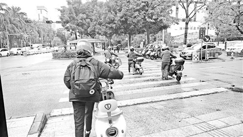 ▲经过执勤民警劝导,电动自行车驾驶员都遵守交规,下车推行过斑马线。