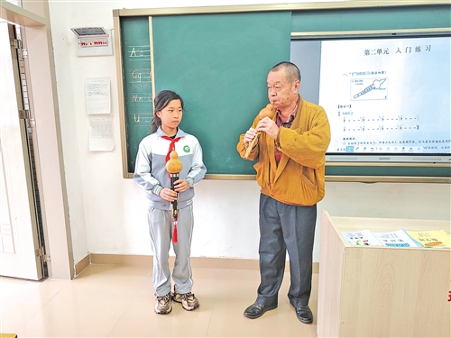 陈佳祥义务教同学们学吹葫芦丝(王锐 摄)