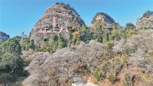 白梅覆山、赤壁如霞,山水与梅花的碰撞,生出震撼人心的美。(张畅 摄)