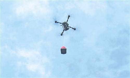 一架无人机吊起装载数十件快递的包裹袋升空,实现快递从圩镇驿站到村级站点的直达配送。(华宣)