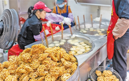 油锅滋滋作响,馓子从玉白炸至金黄,酥香漫溢在江北老街的街巷……这抹金黄,是梅州新春馋人的滋味。
