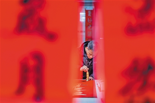 红宣纸框住笔墨流转的瞬间,书法家挥毫落下新春的期许。