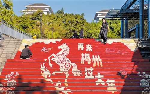 院士广场有人在阶梯上作画,路过的行人与这抹红撞个满怀,拾阶鸿运,马上 “梅”好。