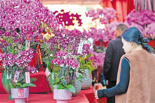市民在院士广场花市选购年花,“平安喜乐”“美好正在发生” 的祝福系在花枝,新春的美好正随花香四处溢出。