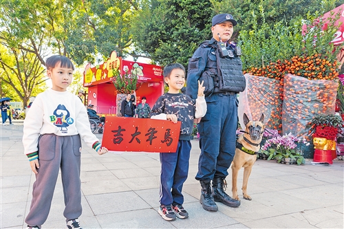 花市上,放寒假的小朋友举着 “马年大吉” 的祝福,与特警、警犬定格下开怀瞬间。守护万家,万家安详,是最美“警”色。