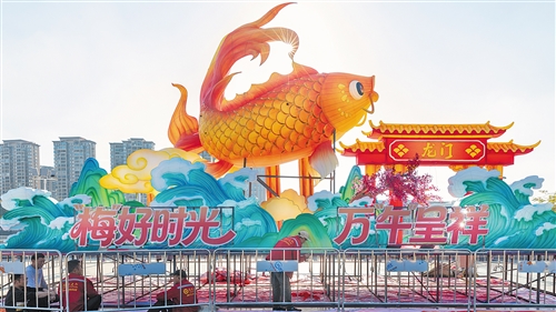 工人正在院士广场布置“鲤鱼跃龙门” 的装置,“梅好时光、万‘午’呈祥” 的期许正跃然眼前。