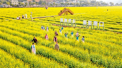 侨乡村油菜花公园百亩油菜花竞相绽放,吸引众多游客前来观赏、拍照。(连志城 摄)