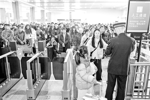 图为2026年2月5日,春运期间,旅客在阜阳站进站乘车。