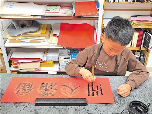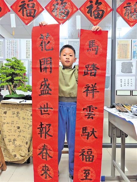 自从孩子学了书法,每年家里的春联都被他包揽了,他也乐在其中,仿佛成了一个小大人似的,为家里的“年味”添砖加瓦。(陈嘉玲 摄)