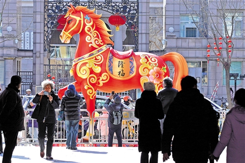 北京隆福寺新春市集上的生肖马艺术装置(2月16日摄)。