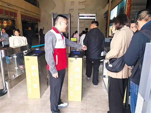 中国客家博物馆里志愿者引导游客有序扫码排队进入。(朱庆强 摄)