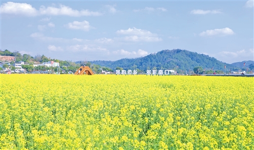 花田间散落着许多别致的标识牌,“油菜花 有才华”“油菜花 有财发”的字样俏皮又讨喜,藏着人们对美好生活的期许;“故事的小黄花,从出生那年就飘着”则带着几分文艺与浪漫,引得不少游客驻足拍照,将这份春日的美好定格在镜头里。田埂旁,一条清澈见底的小河静静流淌,碧波荡漾间,倒映着金黄的花海与岸边的草木,构成了一幅生动的乡村振兴画卷。