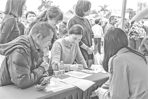 “厂里包吃住吗?月薪多少?”面对求职者的询问,招聘人员耐心解答:“我们厂有班车接送,包食宿。刚开始上班按计时,保底工资2600,超过了计件工资就按计件工资结算。”这样的对话在现场此起彼伏,供需双方围绕薪资、福利、发展前景展开深入交流。