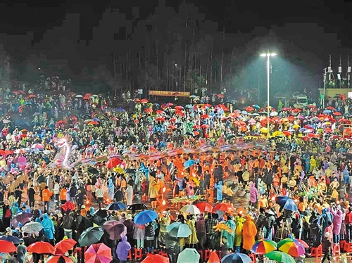 火树银花不夜天,龙马精神舞翩跹。3月3日,农历正月十五元宵佳节,梅州市丰顺县埔寨镇迎来了一年一度的国家级非物质文化遗产——埔寨火龙表演盛会。是日,尽管天公不作美,阴雨绵绵,但来自香港、深圳及全国各地的万名群众依然热情不减,早早涌入火龙广场,共赏这一延续近三百年的民俗盛事,在漫天飞舞的“火花”中祈愿新的一年风调雨顺、百业兴旺。