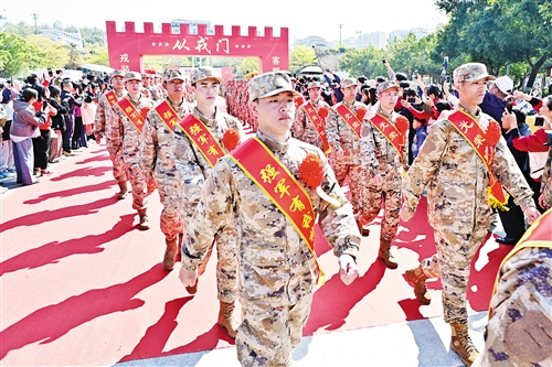 新兵们依次穿过庄严的“从戎门”,市民为新兵们喝彩。(钟小丰 摄)