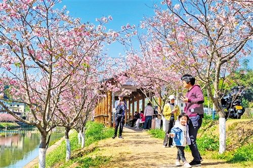 本报讯 (记者张莹娜)近日,梅江区西阳镇直坑村白宫河“一河两岸”上千株樱花迎来最佳赏花期,与潺潺流水、青翠步道相映成趣,构成一幅诗意盎然的春日画卷,吸引大批市民游客前来踏青打卡、定格美好瞬间。