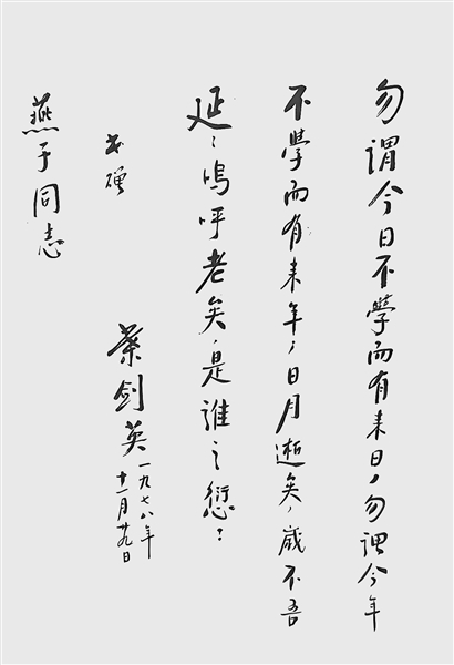 “勿谓今日不学而有来日,勿谓今年不学而有来年,日月逝矣,岁不吾延,呜乎老矣,是谁之愆?”这是叶剑英同志引用朱熹的《劝学文》激励身边工作人员多读书、多学习而题写的赠言。“明日复明日,明日何其多。我生待明日,万事成蹉跎”,《劝学文》和《明日歌》都在告诫人们特别是青少年,要珍惜光阴,勤学奋进。
