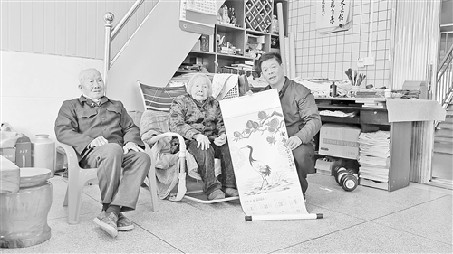本文作者给赖祝娘(中)和赖永芳(左)姐弟赠送《鹤寿图》。