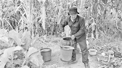 赖永芳双手稳稳提起一只装满水的尿桶,健步如飞走到十几步开外的菜畦。
