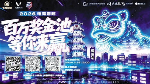 本报讯 (记者李盛华)记者从赛事主办方获悉,2026广东省首届电子竞技超级联赛(以下简称“电竞粤超”)梅州站将于3月29日打线上赛,报名截止时间为3月28日12时,有意参赛者可通过扫描二维码(如下图)完成报名。 据介绍,2026电竞粤超由省委宣传部、省商务厅、省文化和旅游厅指导,羊城晚报报业集团(羊城晚报社)与广东省游戏产业协会主办。赛事设置5大赛区,覆盖全省21个地市,开设《王者荣耀》《无畏契约》两大电竞项目,为本土电竞爱好者搭建舞台。