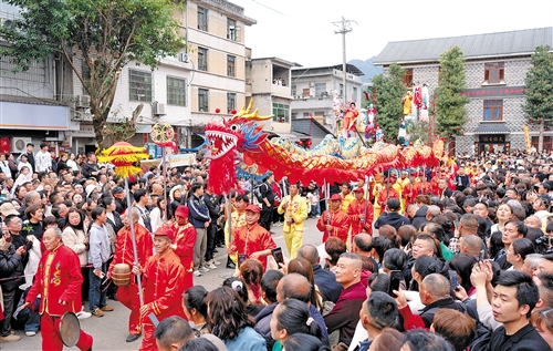 3月21日,在四川省兴文县大坝苗族乡晏州社区,龙灯队开启大坝高装非遗巡游。
