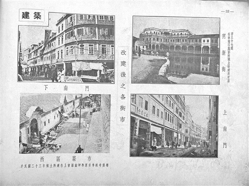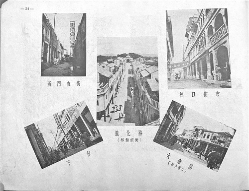 书中“建筑”专栏,刊登了“改建后之各街市”之上南门、下南门、西区菜市(于民国二十三年填土所建,在上市萝匐坪,即原日李姓寺前塘)、宪新街(在市塘唇,为彭姓填土而建,共有店宇三十七间)、西门直街、下市、义化路(即县前街)、大康路、十字街头、井头街,以及松口街市、畲坑街市,共12幅图片。