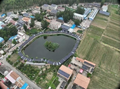 河南省兰考县三义寨乡付楼村内池塘水面环绕铺设的渔光互补光伏矩阵。