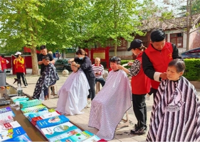 陕西省渭南市华阴市华山镇黄河厂社区组织志愿者为居民提供义剪志愿服务。