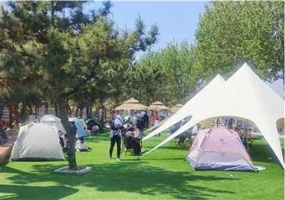 今年国庆中秋假期,山东烟台招远市金岭镇大户陈家村的大户庄园金水湾景区吸引众多游客露营休闲。