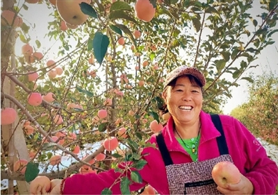 山东烟台招远市金岭镇大户陈家村的种植户在经营的果园里采摘苹果。