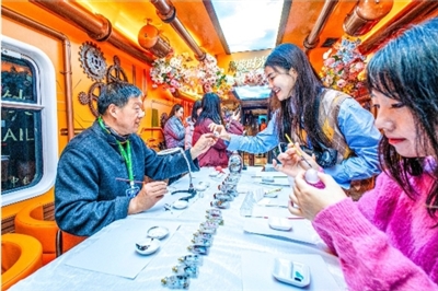 10月30日,全国首列主题娱乐沉浸式文旅专列“津旅时光号”正式发车。该列车以“奇幻时光”为主题,从天津北站驶往蓟州北站,不仅串联起城区与景区的文旅节点,更化身为一座移动的“奇幻主题公园”。旅客可在沉浸式场景与慢节奏旅途中,体验一段独特的铁路奇幻之旅。该专列也为京津冀文旅融合与铁路旅游创新提供了可推广的新样本。图为旅客在“津旅时光号”上体验鼻烟壶内画工艺。