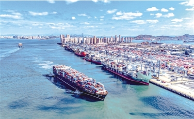 “双11”临近,中国(山东)自由贸易试验区青岛片区跨境电商包裹量激增,商品高效通关后密集装卸船。挂牌六年来,该片区通过创新“区关港+”机制等百余项举措,通关效率提升30%以上,同时建成我国北方最大的船舶交易市场,航运枢纽能级实现显著跃升,为畅通国内国际双循环提供了坚实的物流支撑。图为11月5日,一艘货轮满载货物缓缓靠泊青岛自贸片区。
