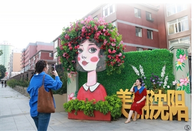 图⑤:沈阳市民在位于青年大街上的玫瑰少女景观小品前拍照。