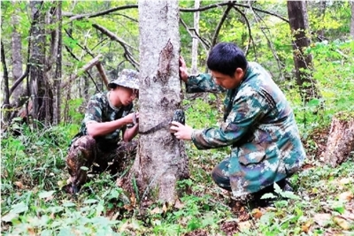 东北虎豹国家公园创新运用红外相机、无人机、卫星遥感等技术手段,构建全域覆盖的“天空地”一体化监测体系。图为巡护员在林中安装野生动物检测设备。