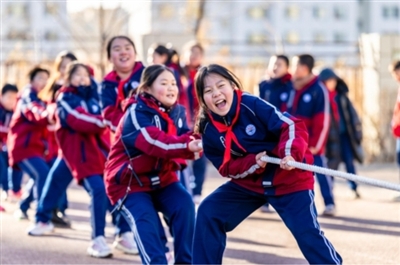 11月25日,内蒙古自治区呼和浩特市玉泉区石东路小学的学生在操场上进行拔河比赛。近年来,石东路小学积极推动校园体育活动“加时”“加量”,通过丰富体育课程、成立体育兴趣小组和社团等举措,让学生在快乐运动中锻炼身体、增强体质。