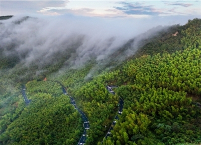 航拍镜头下的广德“竹乡画廊”旅游公路,蜿蜒于万亩竹海之间,绿波起伏,连绵如画。