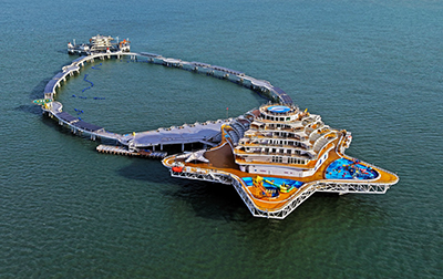 近年来,山东海洋集团持续打造“耕海1号”海洋牧场综合体平台,采用风光互补发电实现能源自给,将智能化养殖系统与清洁能源体系相结合,实时监测海洋环境,创新应用智能投饵、自动洗网等自动化装备,搭载船岸一体化安全管理系统,构建起覆盖生产全流程的数字渔业平台,为现代化海洋牧场建设提供了可复制推广的智能化解决方案。图为位于烟台市莱山区四十里湾海域的“耕海1号”海洋牧场综合体平台。