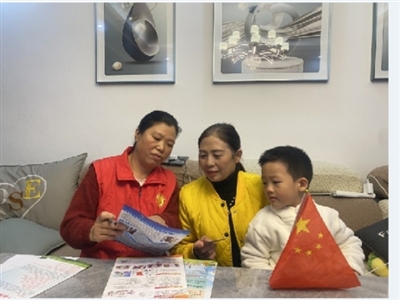 遵义市播州区世纪花园小区楼栋长刘有容入户宣传防电信网络诈骗、防邪反邪、未成年保护等知识。