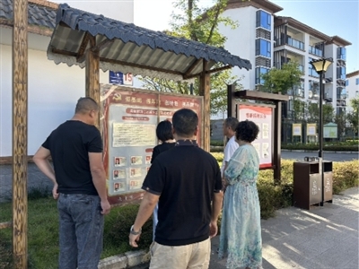 邛崃市居民通过小区公示栏查看党员“双诺双评”承诺事项。