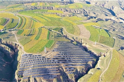 位于内蒙古自治区呼和浩特市清水河县的清水河30万千瓦矿山治理光伏发电项目航拍图。