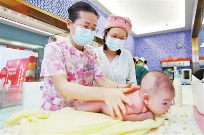 指导妈妈为宝宝按摩。