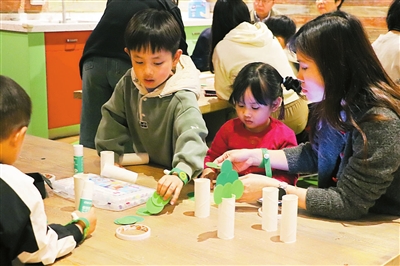 在“对话百兽”项目,孩子们和乐园环保明星“熊猫小吃货”对话,学习环保趣味知识,完成环保材料分类挑战。此外,在“想象再造植树节环保树手工”环节中,亲子家庭利用回收材料制作环保树手工,并在手工上写下对自然的祝福,不仅锻炼了孩子们的动手能力,更让环保理念深入人心。