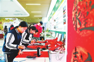 活动现场,学生展示书法课学习成果。 本报记者 朱习 摄