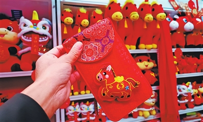 今年爆红的绒布马年布袋,触感软糯且实用性拉满,既可当压岁钱袋派小孩,又能满足收纳需求当钱包或口袋使用。在幸福路批发街,此类创新新品被沿街展示,备受青睐。