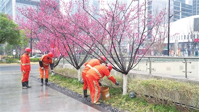 梅树下,熟悉的橙色身影正俯身忙碌,浇水、施肥、拔草、松土……正是绿化养护工人的辛勤耕耘,造就了一季又一季的花事盛景。