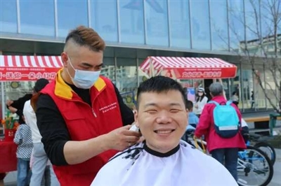 仁爱公益的摊位前,市民有序排队等候理发,40岁的闻小梅自嘲可能是这个广场最年长的志愿者。“我们每个月会做五六场公益活动,我自己就是开理发店的,能用自己的专长为大家服务,我很荣幸。”闻小梅说。