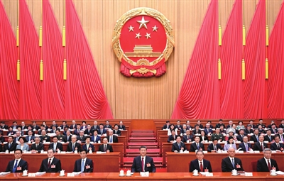人民大会堂大礼堂气氛庄重热烈,主席台帷幕正中的国徽与会场穹顶上的五角星灯交相辉映。