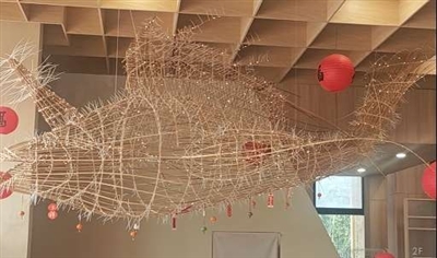 (记者 徐媛) 在黄湖镇青山村访客中心,记者被一条巨型竹编大鱼吸引。这个长约4.5米的手工艺品悬于吧台之上,是青山村的“明星展品”。